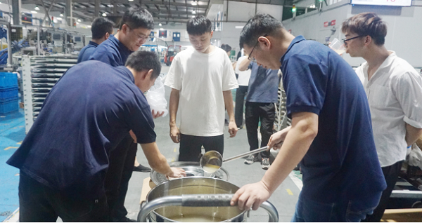 公司黨支部組織了“送清涼小分隊”,兩位黨員一組,每天下午將冰綠豆湯送到生產一線,送到每一位員工手中。一碗冰涼的綠豆湯,卻讓員工感受到火熱的溫暖!